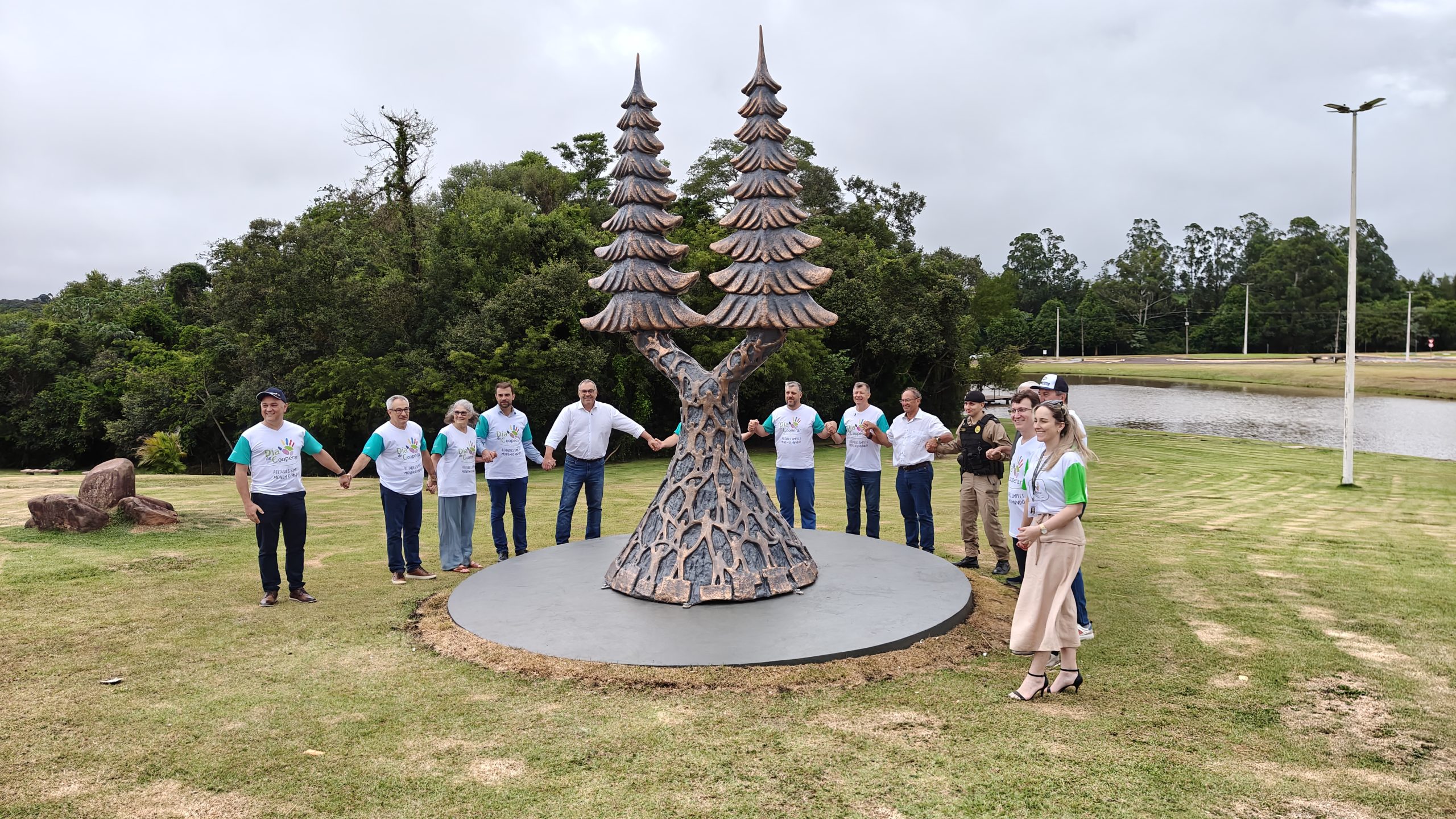 No topo da escultura estão os dois pinheiros, reconhecidos como símbolo universal do cooperativismo. Conforme Turatti, dispostos lado a lado, eles representam união, força e coesão. “O fato de permanecerem verdes durante todo o ano simboliza visão de longo prazo, crescimento contínuo e sustentabilidade, atributos diretamente ligados ao cooperativismo”.